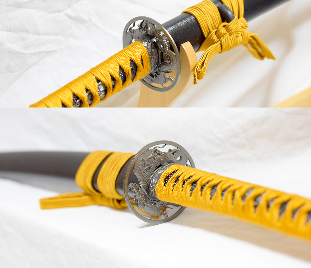 落ち着いた色糸を使い、龍の図の透かし鍔と黒鞘の拵えです。専用の刀袋が付きます。小刀・脇差しもございます。