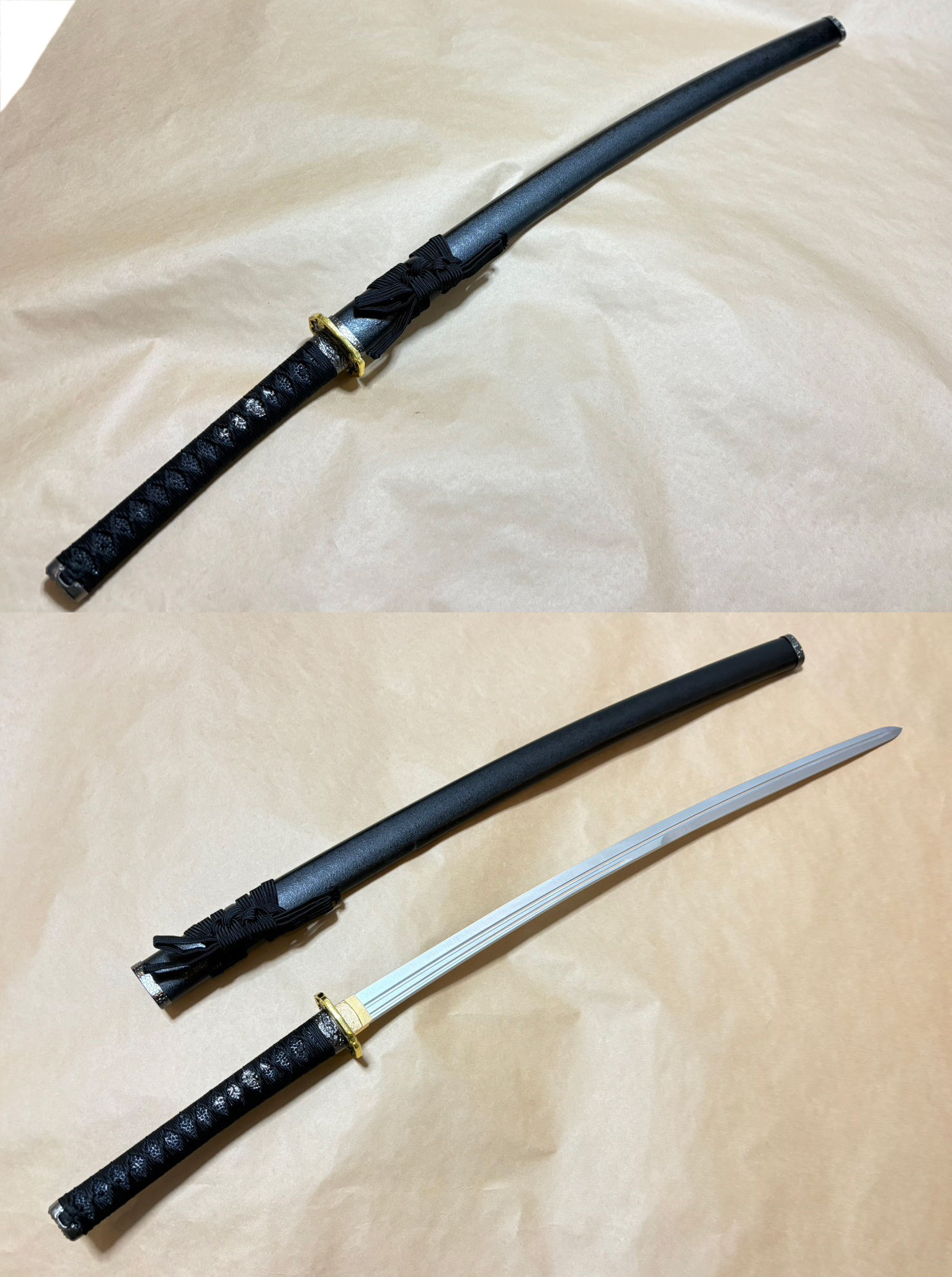 torder_1_20260315竹光模造刀 両刃 拵え 小烏丸刀身・黒基調拵え・金鍔・打刀・竹光小道具