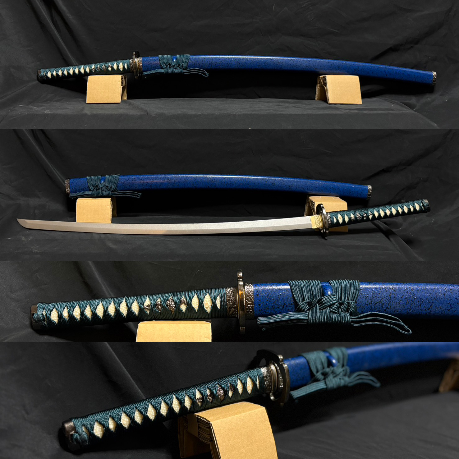 説明:青石目ベースの紺糸をつかった渋めの拵えになっています。刀身は竹光とアルミ刀身より拵え可能です。(こちらの小刀版も制作が可能です。)