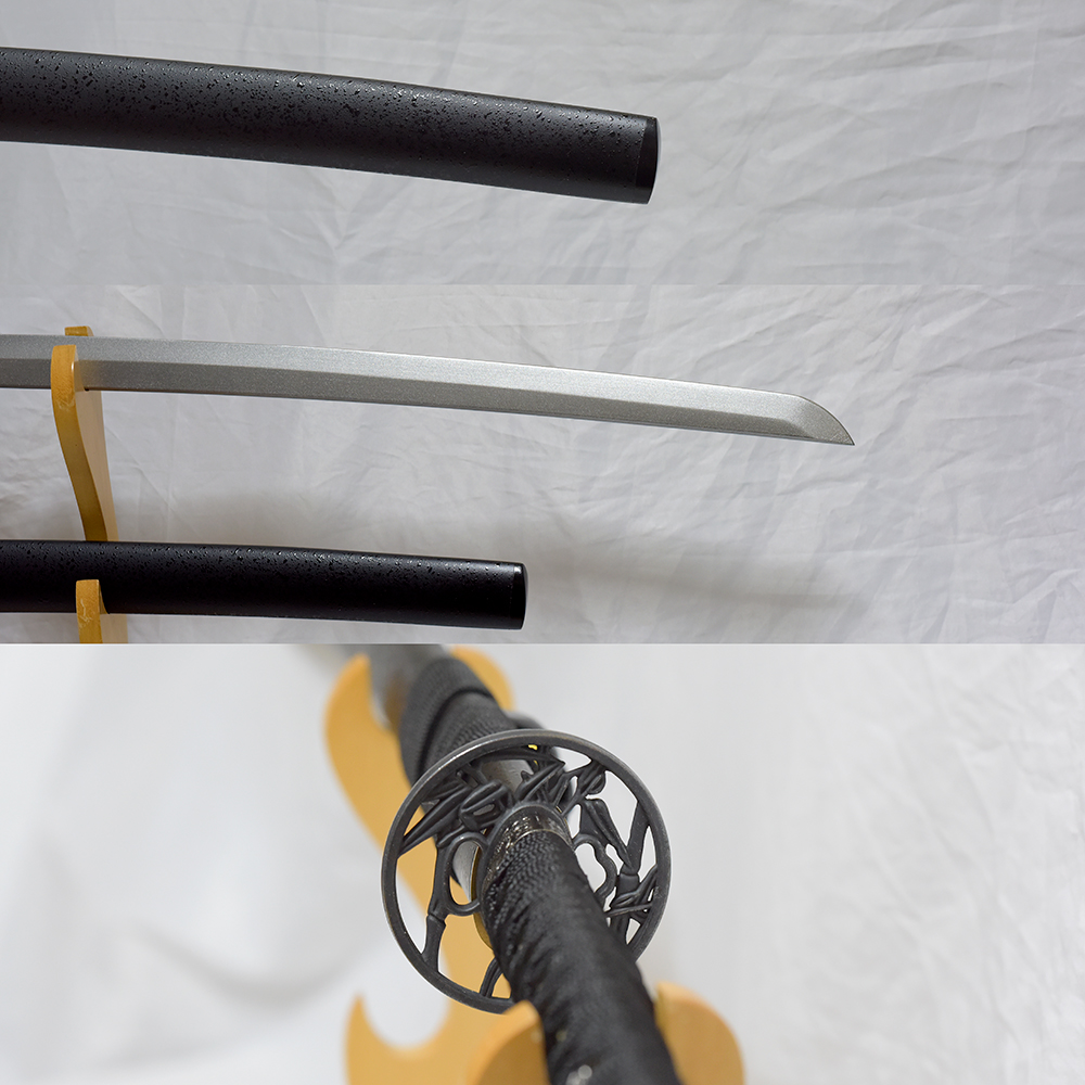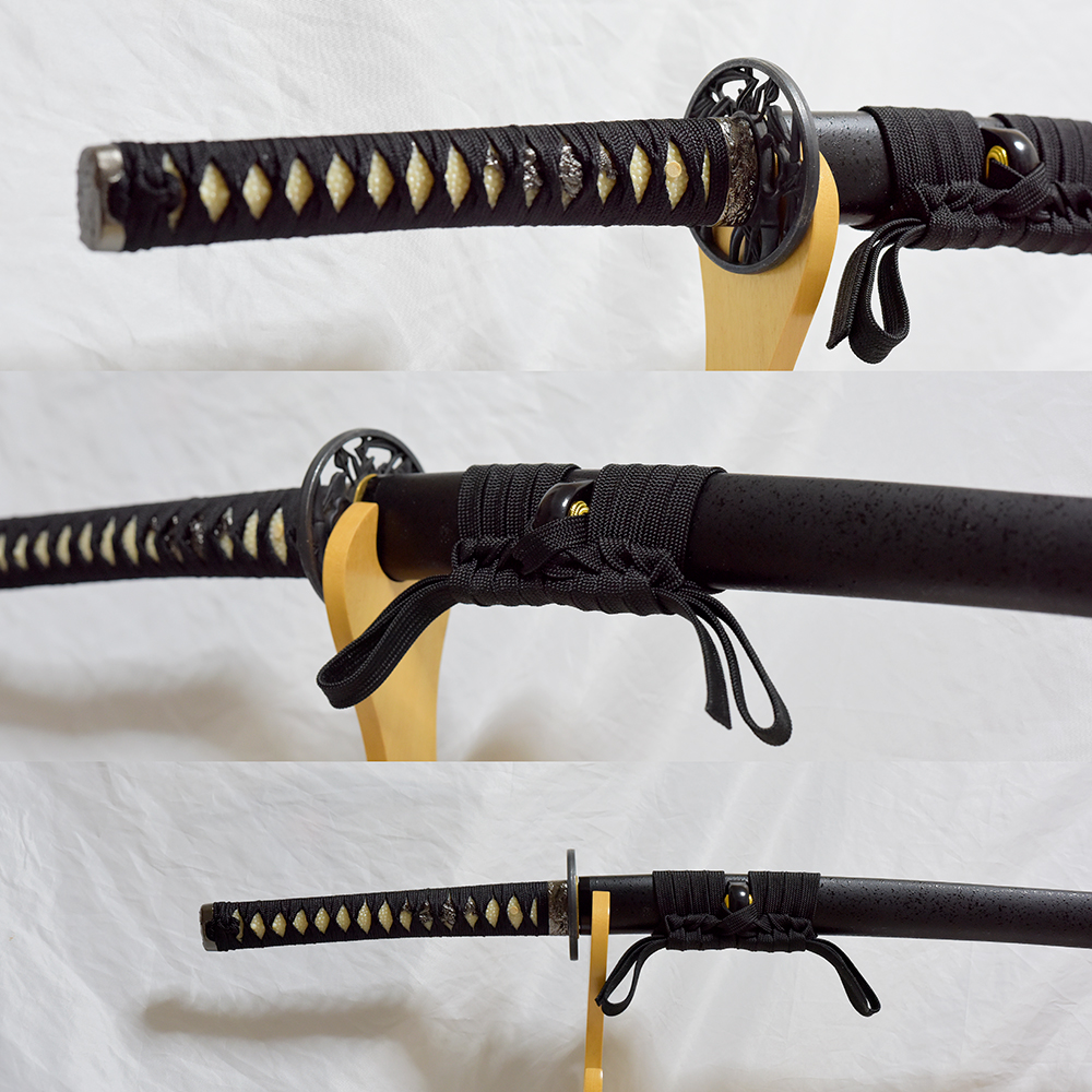 説明:こちらの拵えは軽量でシンプルな石目鞘(木製、金具なし)を利用し、「竹光模造刀 黒石目」と同じ刀身(硬質楓木竹光刀身)と同じ柄(白鮫、黒糸で捻り巻き、黒龍金具3点)で、しっかりと目釘固定で組み上げた日本刀打刀拵え です。